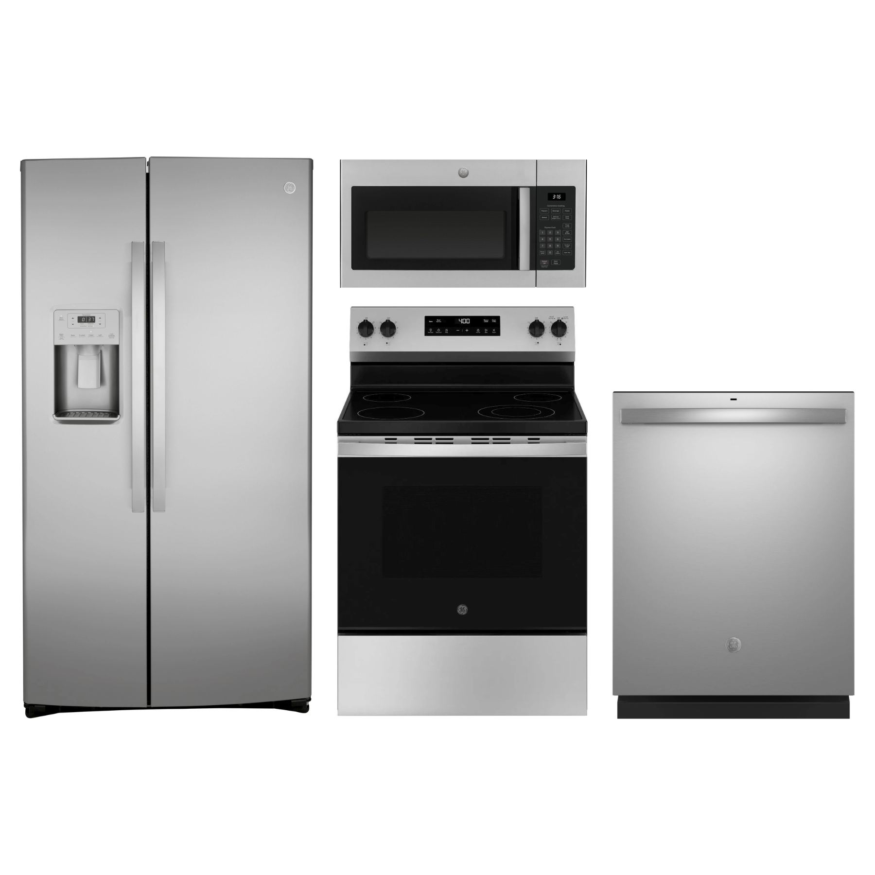 GE® 4 Piece Kitchen Package-Stainless Steel with Side-By-Side Refrigerator, Freestanding Electric Range, Built-In Dishwasher, and Over The Range Sensor Microwave.Read More
